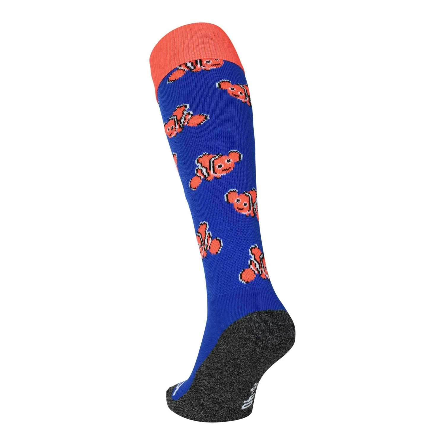 De Brabo Fishes hockeysokken hebben een vrolijke, kleurrijke print en een comfortabel voetbed. De sokken voelen zacht aan en hebben een stevige brede band die de scheenbeschermers goed op hun plaats houden.