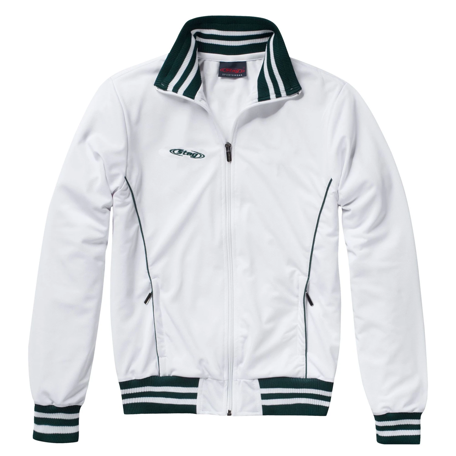 Het Comfort trainingsjack dames wit van het Nederlandse hockeymerk Stag is heel comfortabel uitgevoerd. Het jack is gemaakt van ademend polyester waarop aan de binnenzijde en dun laagje fleece is aangebracht. De kraag, de manchetten en de boord zijn gebreid. In dit Stag trainingsjack zijn twee zakken met ritsen geplaatst.